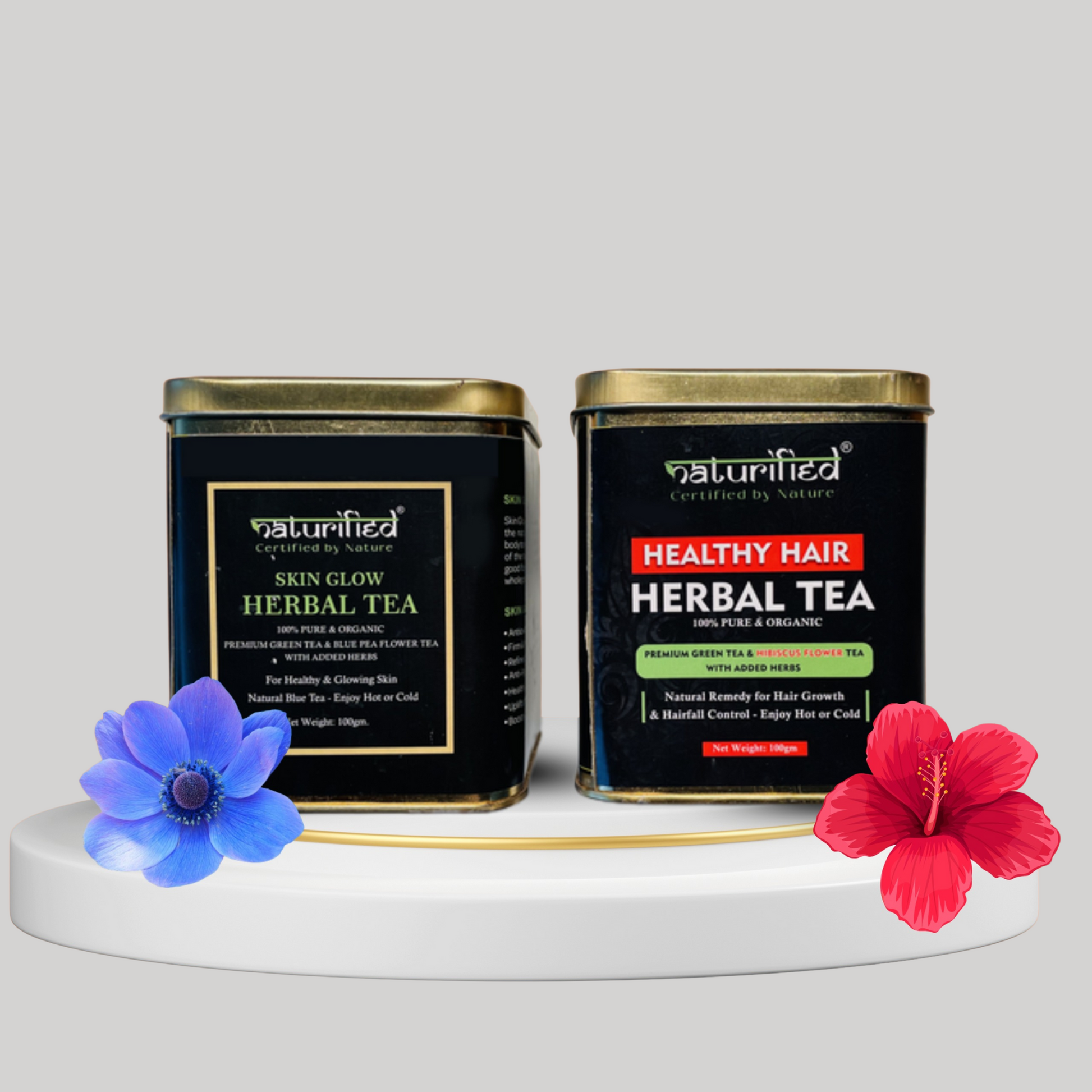 Support your hair and skin's natural radiance with our Healthy Hair + Skin Glow Herbal Tea Combo. Crafted with the perfect blend of natural ingredients, this tea combo promotes healthy hair growth and nourishes the skin for a natural, glowing complexion. Enhance your beauty from within with our herbal tea combo.